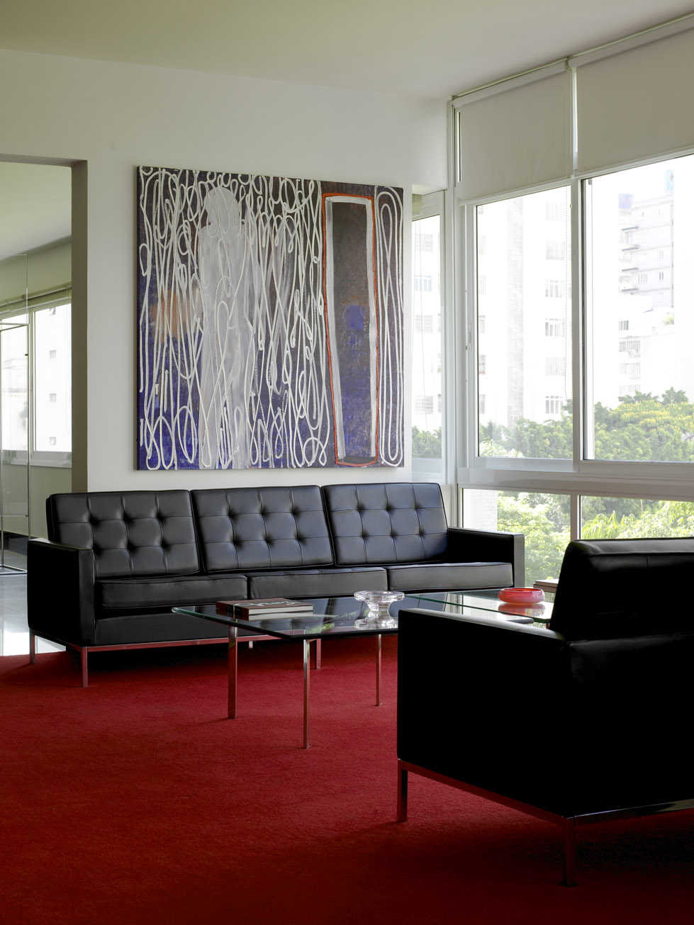 上图是一家公司的会客室的场景图,以红、黑色为主调来显示公司的正规,一般黑色会给人一种压迫感,但上图的搭配却给人非常舒服的感觉,一般公司会以1+2+3进行来设置自己的地方,但上图以2+3结合,而且茶几并不只是一个来搭配,而是两个连在一起,来进行搭配,如果你们公司需要这种搭配,可以买下诺尔沙发和巴塞罗那茶几,来显示出高端大气。