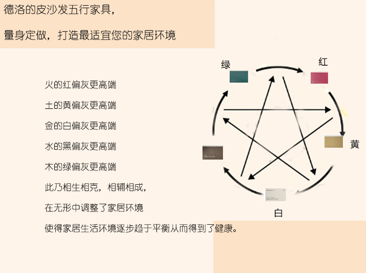 大家如果了解了自己的个性特征,大家可以根据金木水火土做一个对照和比较,然后选择不同五行色彩的客厅真皮沙发或布艺沙发去搭配家居环境,从而能够增强家居以及个人的运势,这就是家具中五行色彩的应用了。我们五行家具就是专门为大家提供私人订制,量身定做,最适合于你的家居环境,欢迎垂询。