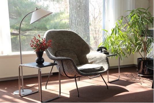 Womb Chair,由Eero Saarinen在1946年设计,简约、独特的外形,是一款时尚、美观而且实用的椅子,配带有不锈钢脚的脚踏,让人悠然自得地享受生活乐趣。