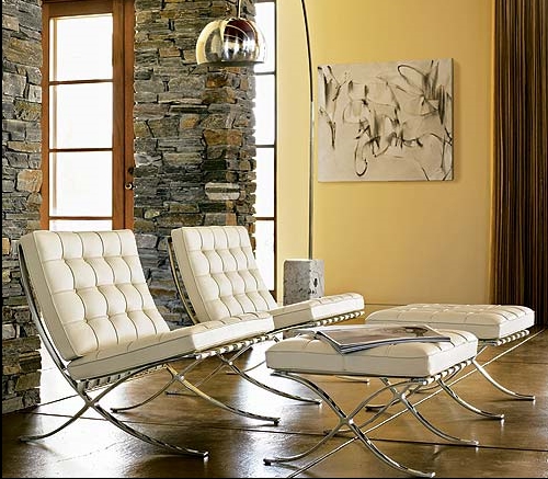 巴塞罗那椅由设计师密斯在1929年巴塞罗那世界博览会上,为了欢迎西班牙国王和王后而设计,同著名的德国馆相协调。这件体量超大的椅子也明确显示出高贵而庄重的身份。当年的世博会德国馆是密斯的代表作,但由于建筑的设计意念独特,竟没有合适的家具与其搭衬,所以他不得不专门设计了巴塞罗那椅来迎接国王和王后。