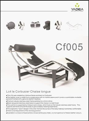 现在是设计室内家具及配饰设计师的首选家具之一。其原理就在柯布西耶躺椅(Chaise Longue)是他为居家室内设计的最休闲的最放松的一件家具,它有极大的可调节度,可调成从垂腿坐到躺卧的各种姿式。它由上下两部分构架组成,如去除基础构架,则上部躺椅部分可当作摇椅使用。
