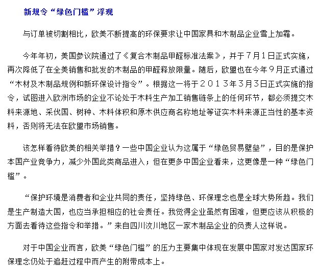 最日,欧盟确定了“木材及木制品规例和新环保设计指令”会在明年3月实施,要求进口到欧盟市场的木制品必须获得森林管理委员会(FSC)的认证,新规执行对中国家具出口企业而言,是挑战也是机遇。正规的品牌和厂家认为,实施中国政策是抬高了行业的门槛,通过淘汰不正规的企业来促进规范的企业。但也有很多人认为,这个政策会使成产的家具价格变高,因为认证FSC森林的供应商会减少,供不应求使原材料价格变高,这会使得刚刚起步的家具企业面临倒闭的现状,也会使得很多家具公司退出欧洲市场,这也会面临有不少人失业,产生失业现况。