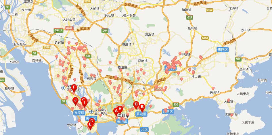 上面是一些知名的家具卖场分布,有些家具卖场没在这上面,像我们公司在龙岗和福田都有卖场,如果想购买产品的可以去这些地方看看,我们公司的联系电话为:4000168398,打这个电话为市内免费。