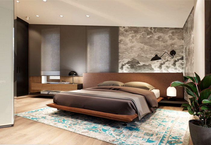 如你所见,当布艺沙发遇上高贵的紫色,空间的低调奢华不言而喻。视线所及,还有木质地板,混凝土墙面,铁制储物架,设计师运用大量不同的材质,让整个公寓看起来丰富而质感。