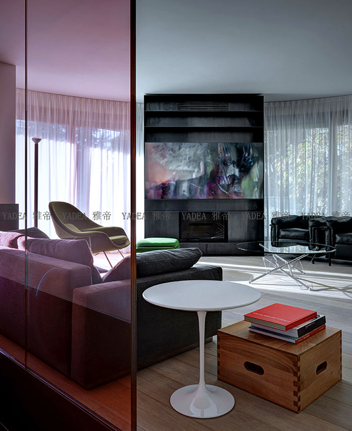 我们首先看到的是客厅,客厅选用大量的黑白色系搭配,营造出酷感十足的魅力氛围,用到绿色的子宫椅、白色的郁金香桌、黑色的柯布西耶沙发配上大屏显示屏,加上良好的采光,让客厅充满了现代时尚的气息。