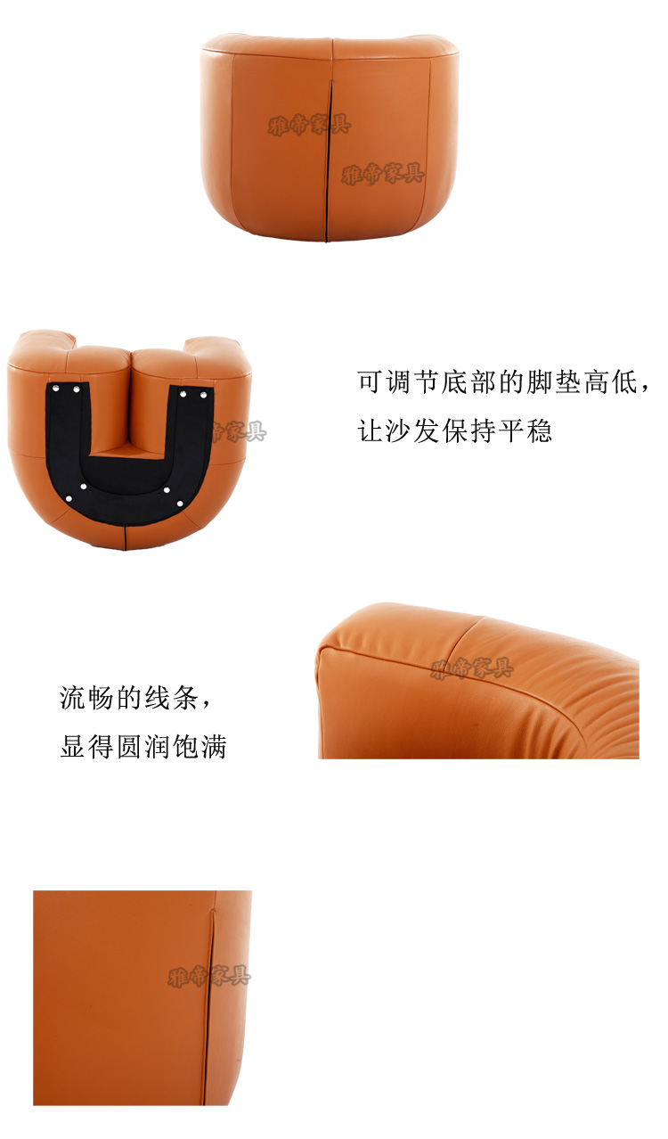 流畅的线条,显得圆润饱满。可调节底部的脚垫高低,让沙发保持平稳。